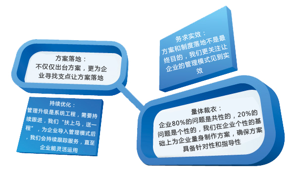 企業(yè)發展過程中,面對自(zì)身組織架構和戰略發展的困惑,以及内部各體系的建立落地,需要借助外部專家力量進行推行,避免矛盾優化執行,可以通(tōng)過成立管理咨詢項目的形式,進行變革和推進。 普度拒絕方案式的咨詢,旨在幫助客戶解決體系方案落地,監督執行,在不斷的反饋中優化結果。普度咨詢顧問團隊均為(wèi)有10年(nián)以上(shàng)管理經驗,行業(yè)經驗豐富,對于企業(yè)的管控體系、财務體系、人力資源體系、文化體系等建設落實有獨特優勢。并且與學院派專家聯系密切,做到(dào)上(shàng)能(néng)構建方案模型,診斷問題,下(xià)能(néng)跟蹤執行,保證落地。 針對小(xiǎo)企業(yè)咨詢案例,提出了新的服務模式,小(xiǎo)企業(yè)無法在咨詢項目中投入過大,而且對學院派的理論指導沒有消化能(néng)力,但急于執行變革。普度成立了咨詢項目團隊,直接進入到(dào)企業(yè)實際工(gōng)作,并在一(yī)定周期内,切實解決企業(yè)問題之後,交接給企業(yè)相(xiàng)關方法和成果,之後定期随訪,保障企業(yè)在小(xiǎo)投入的情況下(xià),循序漸進的解決實際問題。